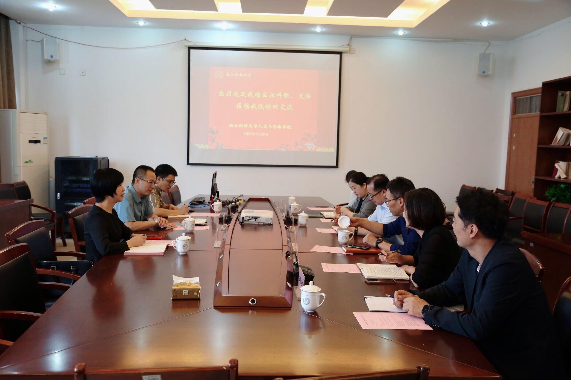 9月29日上午,杭州市钱塘区社科联主席贺学兵、文联副主席沈小玲等一行3人来我院交流调研。校党委委员、组织部、宣传部、统战部部长楼胆群、宣传部副部长毛鸽,学院院长周保欣、学院党委书记高燕及学院骨干教师参加了调研交流活动。会上,楼部部长代表学校对钱塘区社...