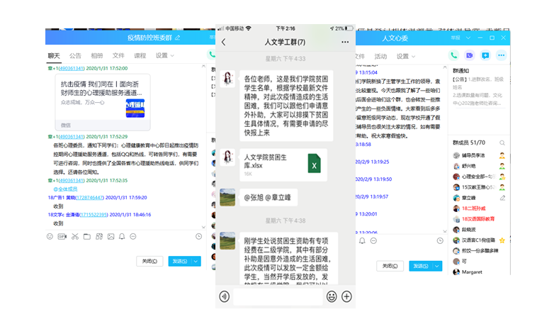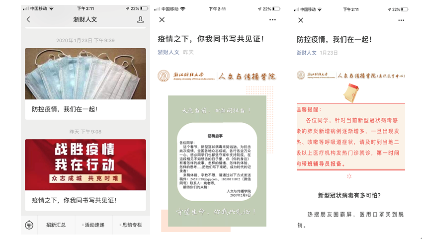 人文学院充分发挥专业特点,疫情发生后,在全院学生中迅速推出“疫情之下,你我同书写共见证”征文活动,活动得到学生们的积极响应,并通过学院微信公众号持续推出学生系列纪实作品。学生工作办公室启动突发事件家庭困难学生临时补助,做好三困生等特殊群体的动态掌握和关心指导。同时还开通了24小时网络电话服务,为广大学生提供心理援助服务。并积极通过微信公众号,推送防疫知识和心理知识,着力化解学生心理恐慌,降低潜在风险。