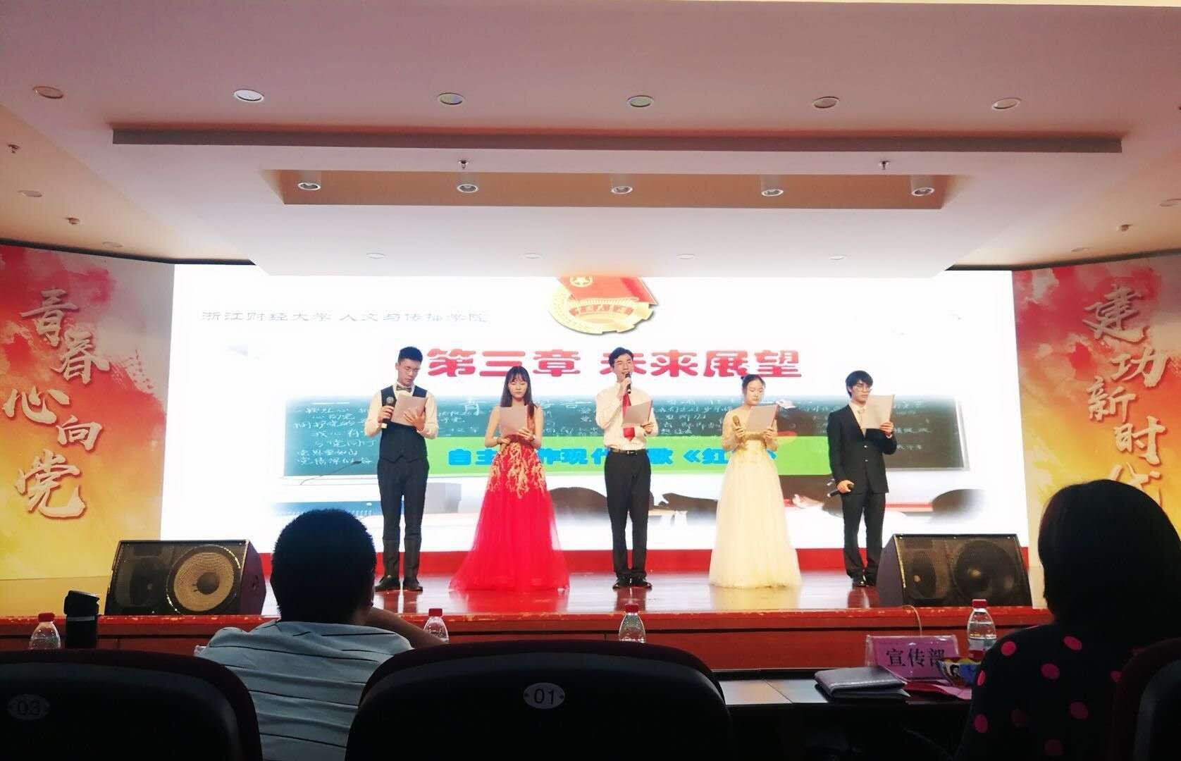 该团支部着力打造班级团支部“五彩”文化,不断推陈出新,向现场评委和观众展示了团支部“红岩读书”、“金色历史”、”青听之声”、”蓝色志愿”、”紫色团建”五大特色活动。现场,郭继、陆郡益、姚诗琪、林鹏伟、胡恩润五名同学朗诵了团支部创作的诗歌《红船》,结合学院特色,追溯红色轨迹,展现了我院青年积极向上的风采面貌和团支部建设的优秀成果。