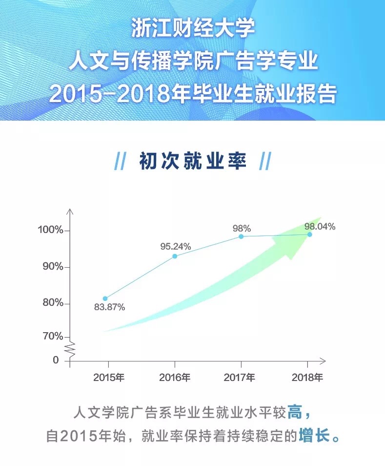 浙财广告学专业创立于2002年,至今已有17年的发展历史,专业教育扎实深厚,教学成果卓越。在2016年浙江省教育评估院的毕业生满意度调查中,我院广告学在专业满意度一项排名全校第一。