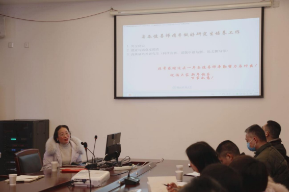 规范研究生导师指导行为实施细则》文件精神,指出研究生导师是研究生培养第一责任人,导师不仅是研究生的学业导师,更是人生导师。接着从我院研究生整体情况、安全稳定风险研判、近5年研究生质量培养(论文、项目、学科竞赛、奖学金、社会实践等)、就业(就业率、毕业跟踪调查、学科评估)等四个方面进行了汇报,充分运用数据进行分析研判,查找研究生培养的薄弱点,希望与各位导师一起携手努力,共同推进我院研究生培养。