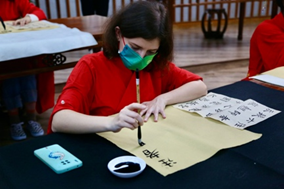 活动三“跨文化交流”,师生们进行自由观展和一对一的书法指导,阮斌杰同学弹奏古琴、石琴,邀请师生体验,并且通过弹曲猜名的方式赠送十支手作传统发簪给中外师生;赞比亚的木槿同学演唱越剧和中文流行歌曲,21级研究生南洋身着汉服也为大家演唱中文歌曲;日本的天美老师与同学们讲述汉字在日本的使用情况,以及如何克服“汉字难”的趣闻;俄罗斯的几位同学与中国学生一起讨论杭州亚运会吉祥物的象征意。大家在这一环节显示出很高的观览兴致,也展现了中外交流中倾听与沟通的耐心,坚持书写与感知汉字之美的恒心,以及对中文和中国文化的倾心。