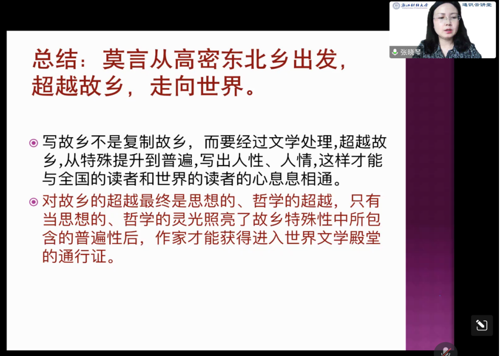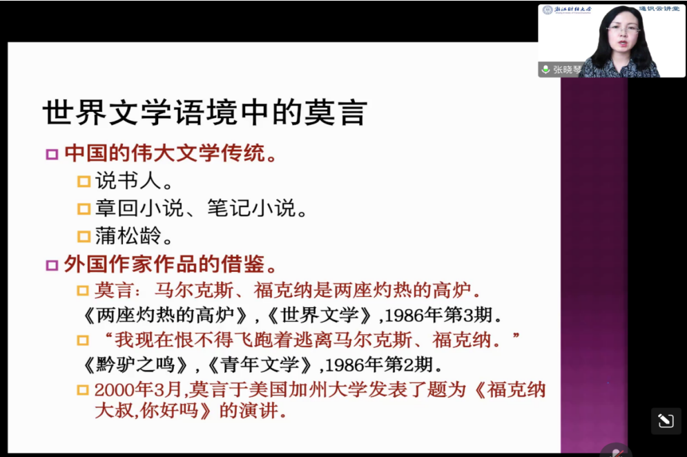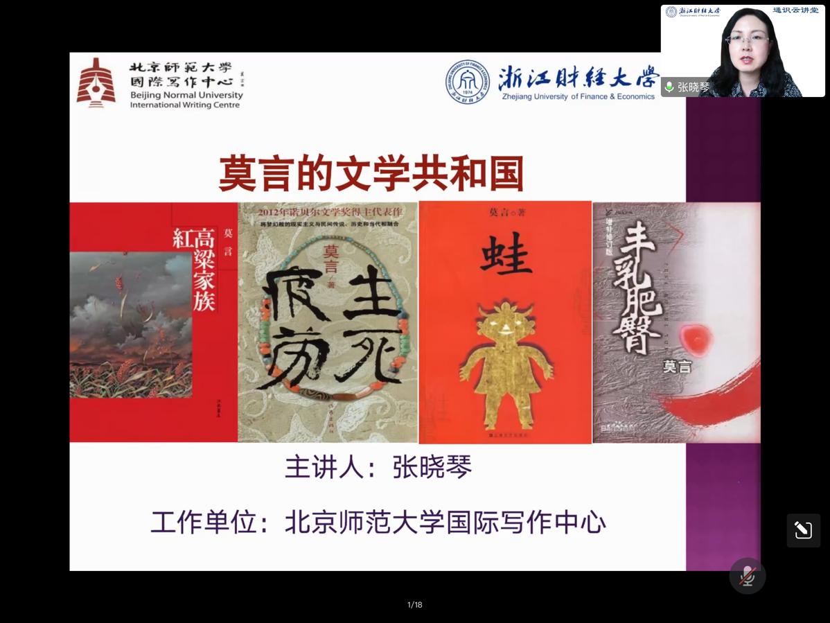 6月2日,北京师范大学博士生导师、国际写作中心主任助理张晓琴教授应邀为我院师生举办了一场题为《莫言的“文学共和国”》的学术讲座,全方位、多维度给我们展示了中国惟一诺贝尔文学奖得主莫言的“文学共和国”。讲座由吴智斌老师主持,近900名我校师生通过腾讯视频会议、钉钉群收看了讲座。