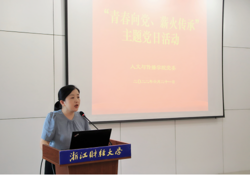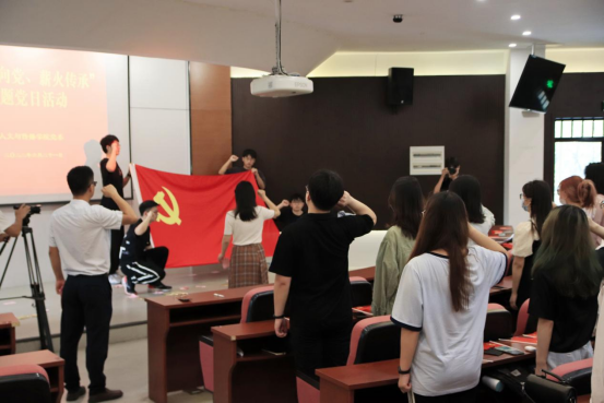 活动中,学院第四党支部书记刘华婷老师带领全体与会党员重温入党誓词。全体党员面向党旗,紧握右拳,向党庄严宣誓,在铮铮誓词中,增强对党的坚定信念,深刻铭记作为党员的责任和使命。随后,毕业生党员为2022年上半年新发展党员佩戴党徽,送上了美好的祝福和深切的嘱托。
